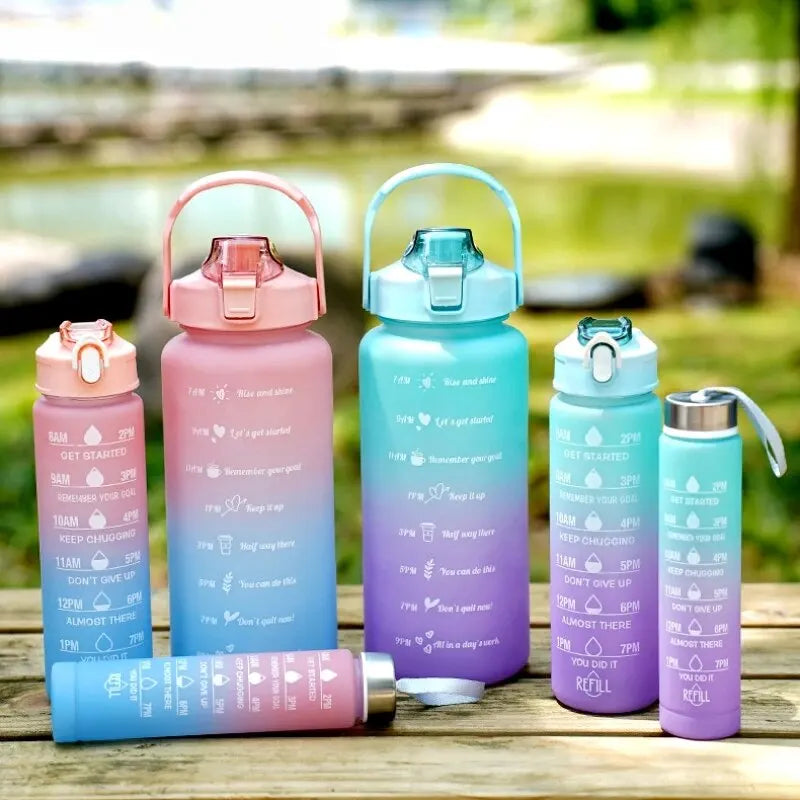 Découvrez notre Ensemble de Trois Gourdes Plastiques, les accessoires incontournables pour tous les passionnés d'activité physique et les adeptes d'une hydratation optimale. Cet ensemble de trois bouteilles est un véritable allié pour maintenir votre apport en eau tout au long de la journée. Avec un dégradé de couleurs dynamique, ces récipients vont de grande à petite taille, convenant à tous vos besoins. Chaque bouteille est munie d'une poignée ergonomique, assurant une prise en main aisée lors de vos déplacements. Leur surface est parsemée de messages motivants et un horaire de consommation est ingénieusement marqué, vous encourageant à rester hydraté à intervalles réguliers. Les deux plus grandes gourdes sont équipées de pailles discrètes pour une utilisation sans effort, tandis que la plus petite se distingue par un bouchon pratique à visser. Conçu pour les esprits sportifs et pour ceux qui privilégient une bonne hydratation, cet ensemble est parfait pour le gym, les randonnées, ou simplement pour rester dynamique toute la journée.